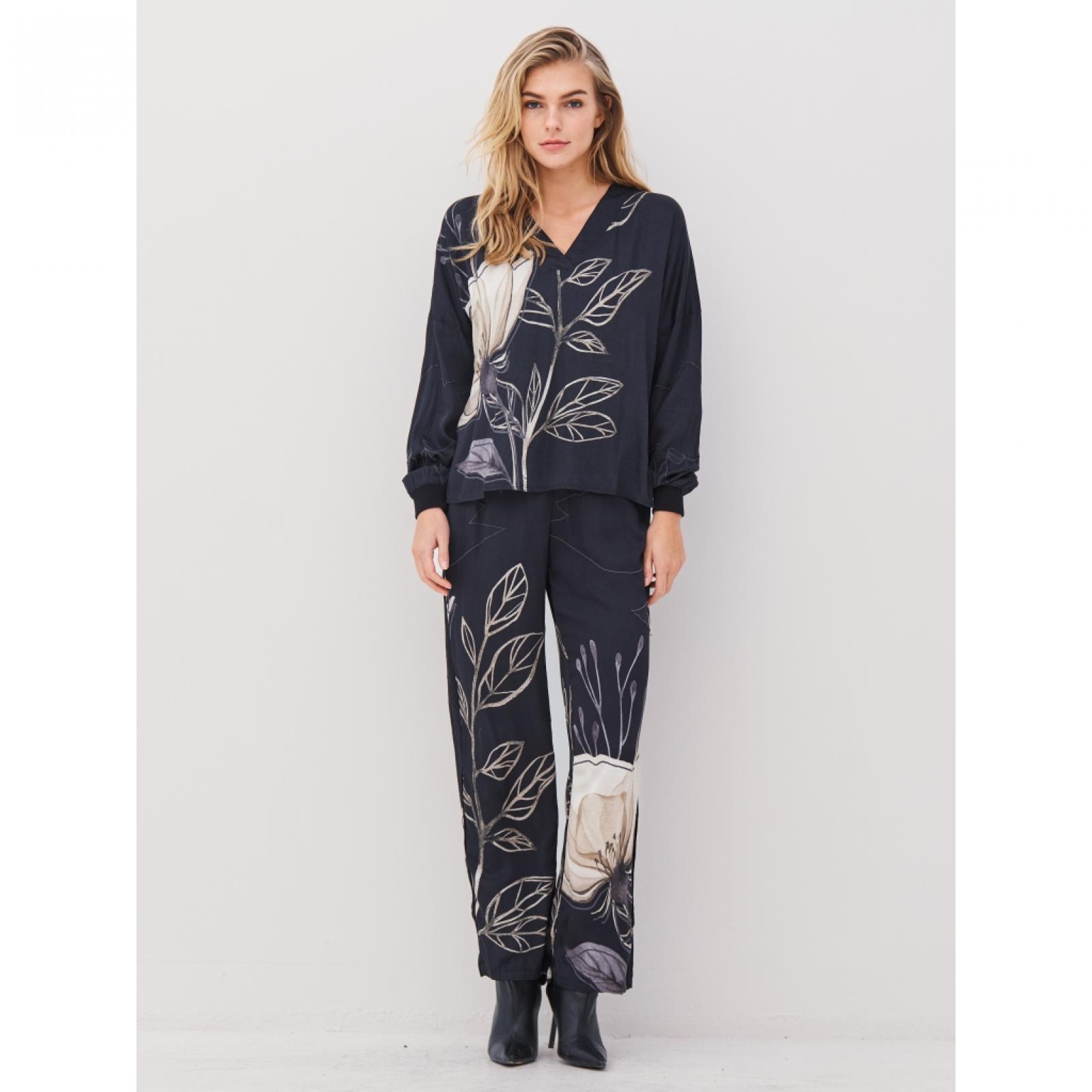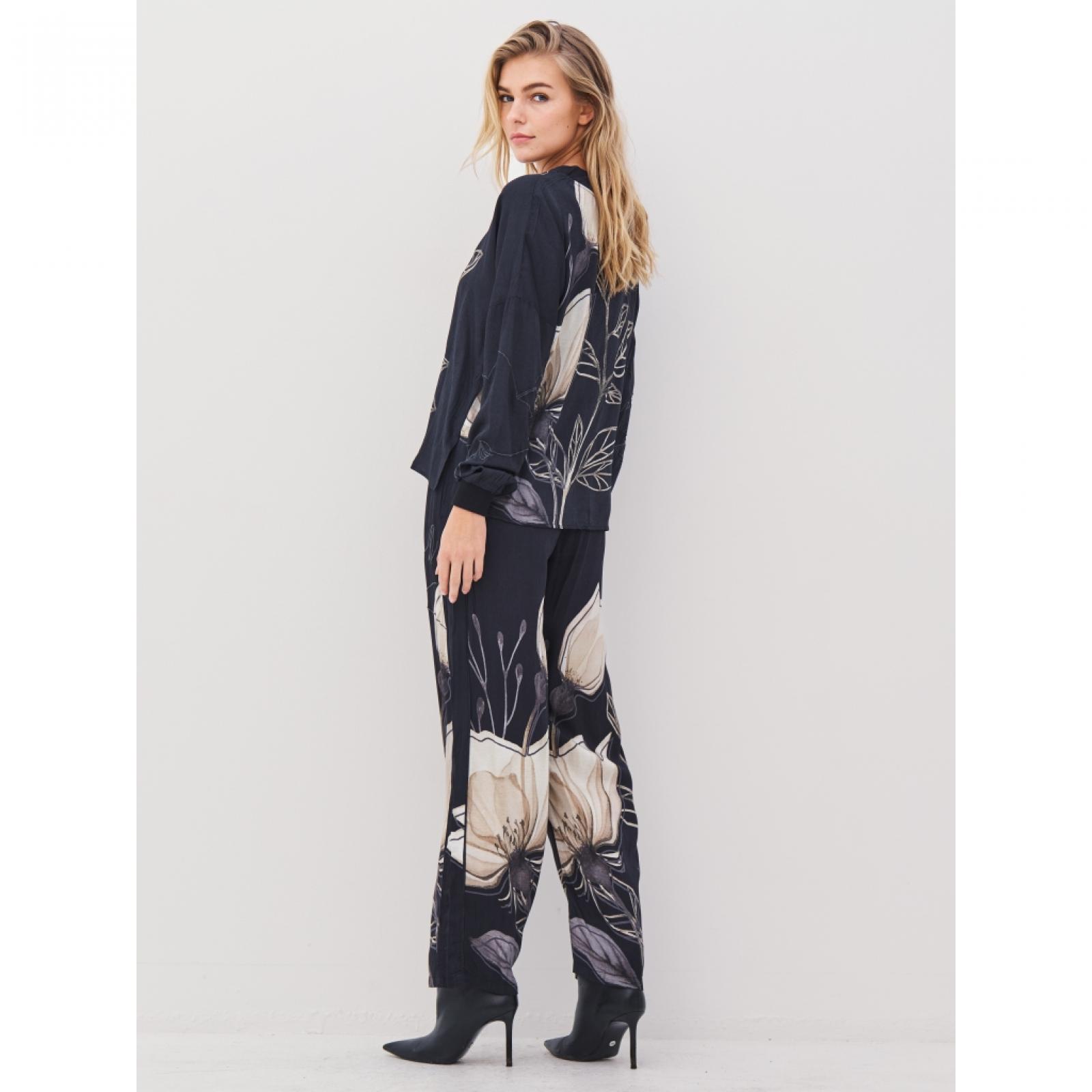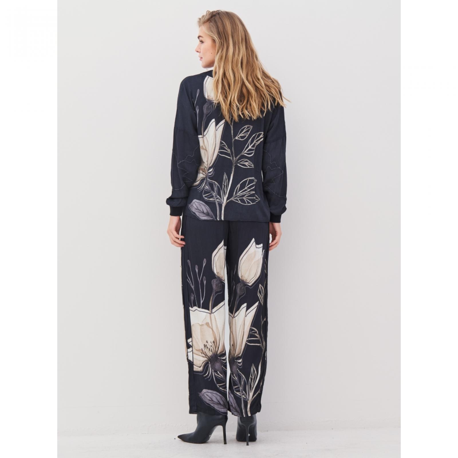 8514-50-000 Ez a blúz a laza szabást egy gyönyörű, kézzel rajzolt virágmintával ötvözi, amely elegánsan és lazán illeszkedik a testedre elöl és hátul is. A blúz széles szegélyű V-nyakkal és bordázott mandzsettás hosszú ujjakkal rendelkezik, amelyek sportos csavart adnak a nőies stílusnak. A blúzt a hozzá illő nadrággal kombinálva, harmonikus és jól összehangolt szettet kapsz. Mellbőség: XS: 101 / S: 105 / M: 109 / L: 115 / XL: 121 / XXL: 127 Derékbőség: XS: 104 / S: 108 / M: 112 / L: 118 / XL: 124 / XXL: 130 Háthossz: XS: 64 / S: 65,5 / M: 67 / L: 68,5 / XL: 70 / XXL: 71,5
