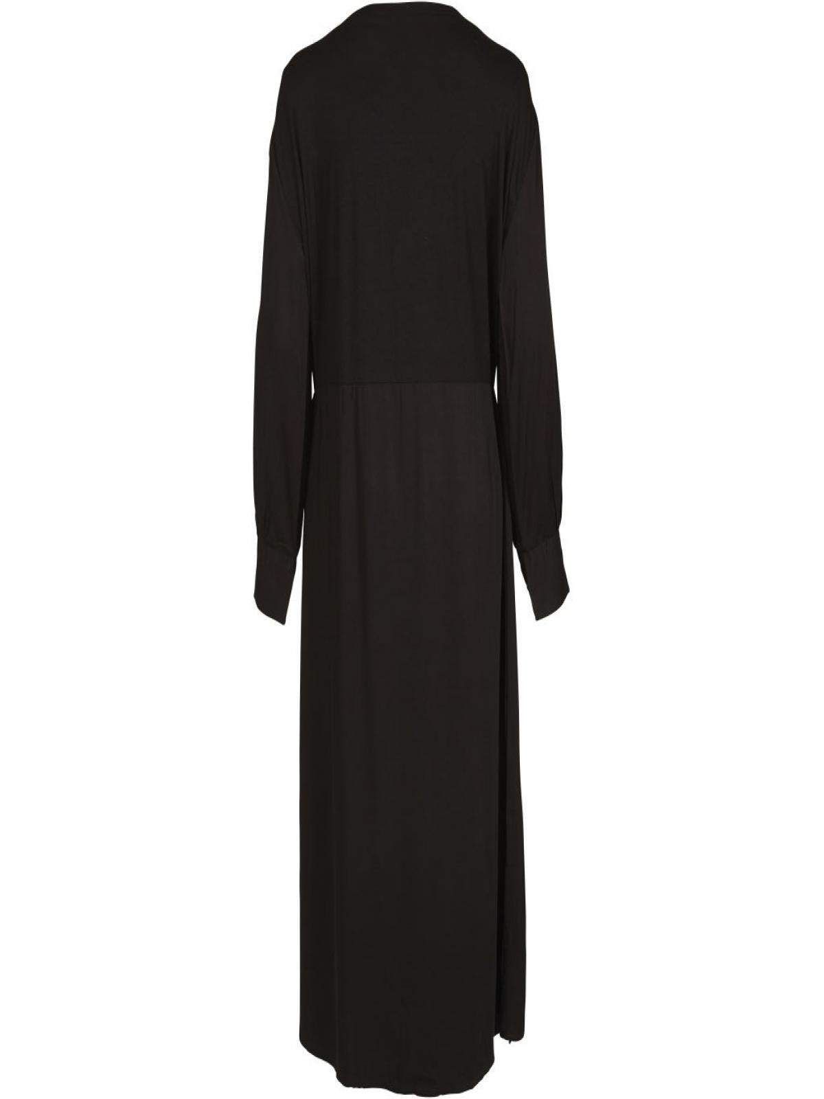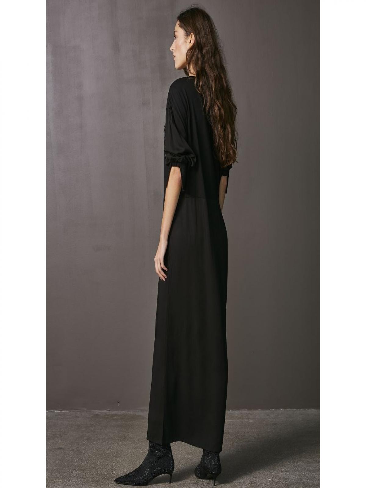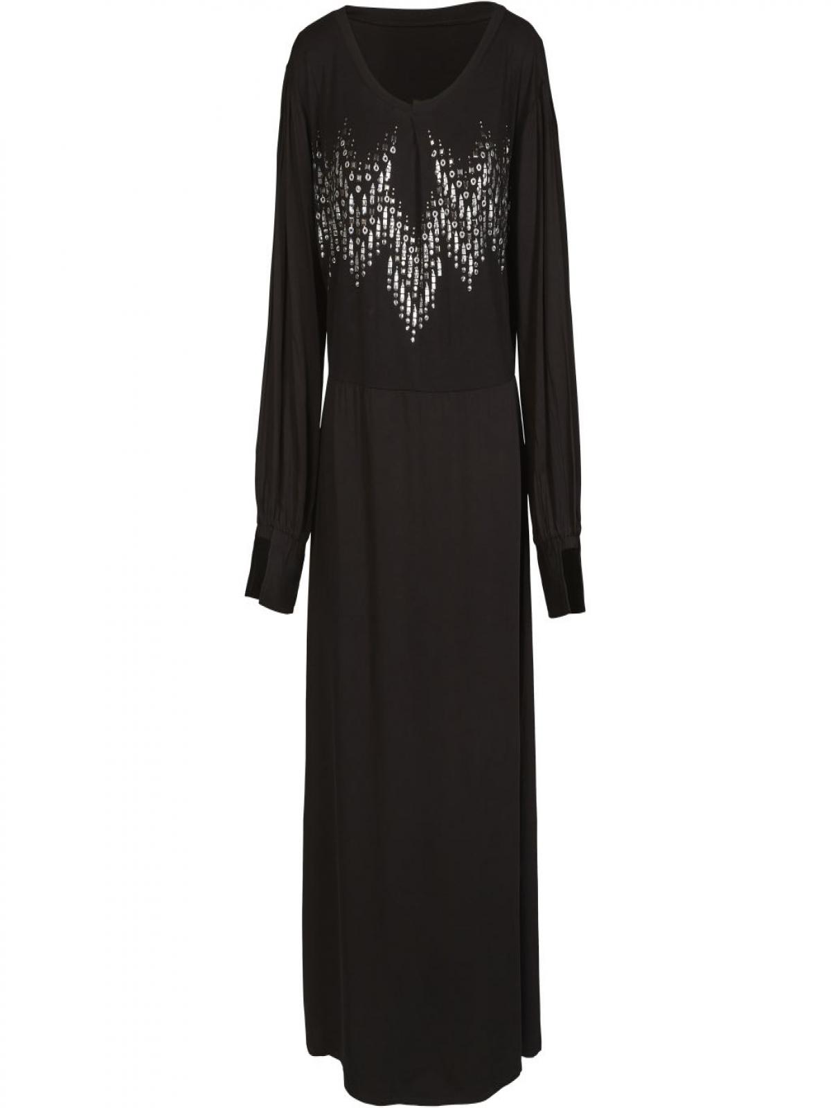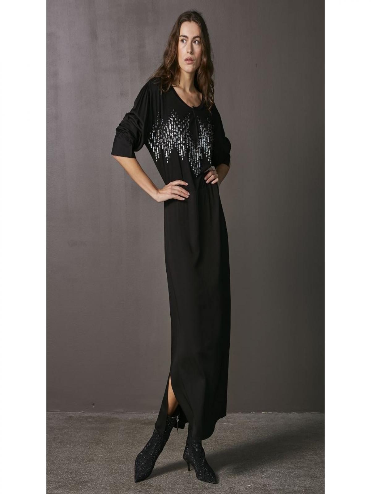 8153-23-000 Gyönyörű fekete hosszú ruha, elöl elegáns egyedi fólialenyomat és kézi varrás felhelyezett fém díszítéssel kivitelezett.Tökéletes viselet minden napra, de különleges alkalomra is egy magas sarkú cipővel elegáns megjelenés garantált.