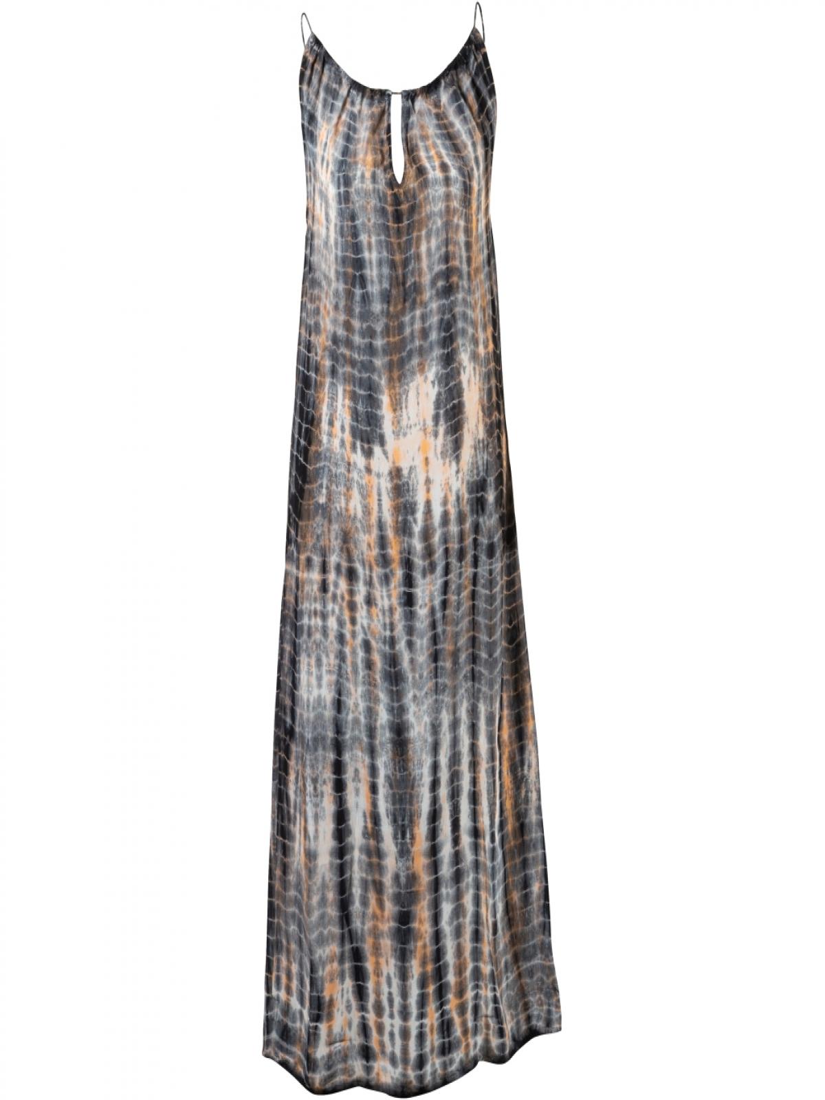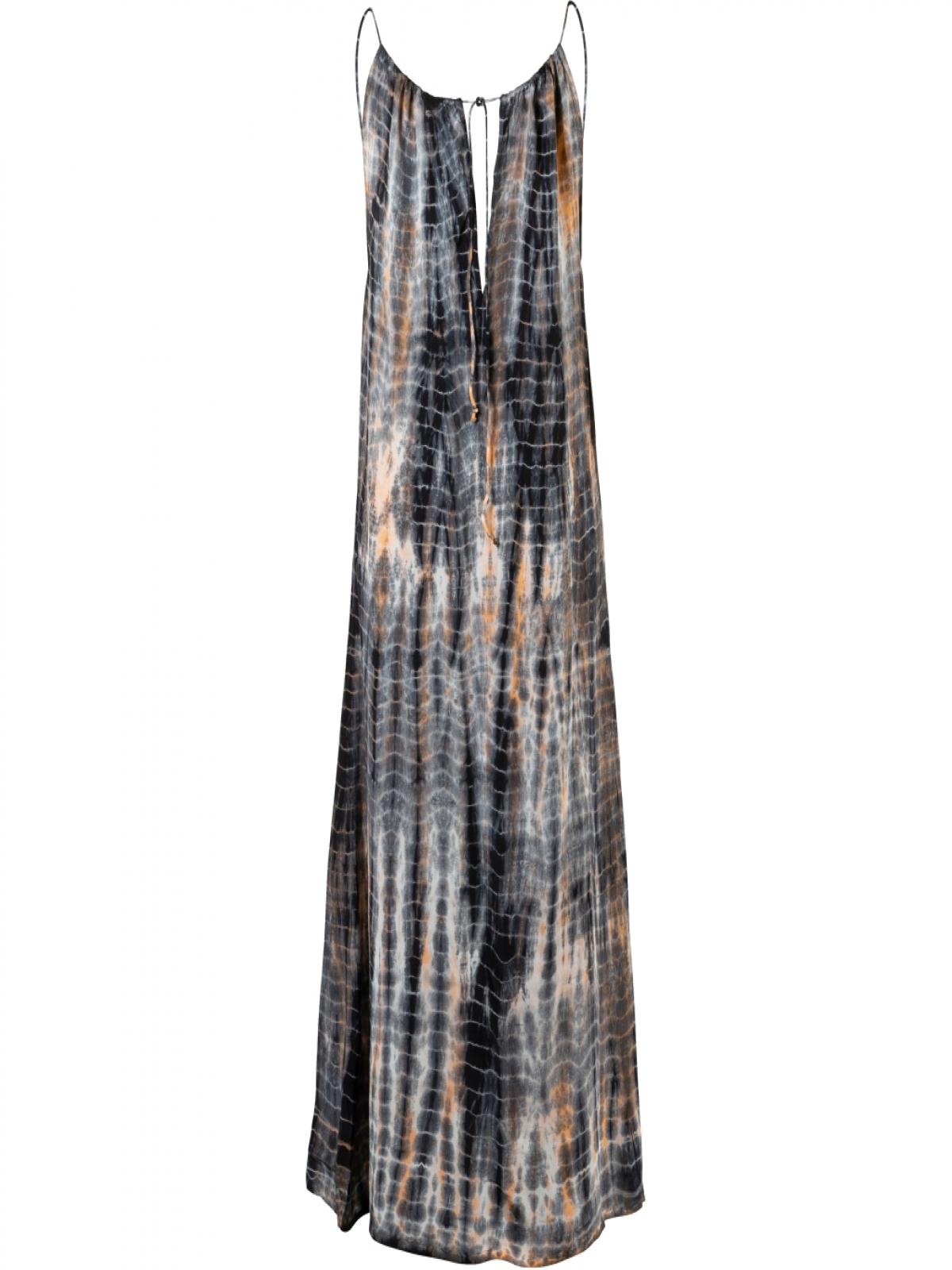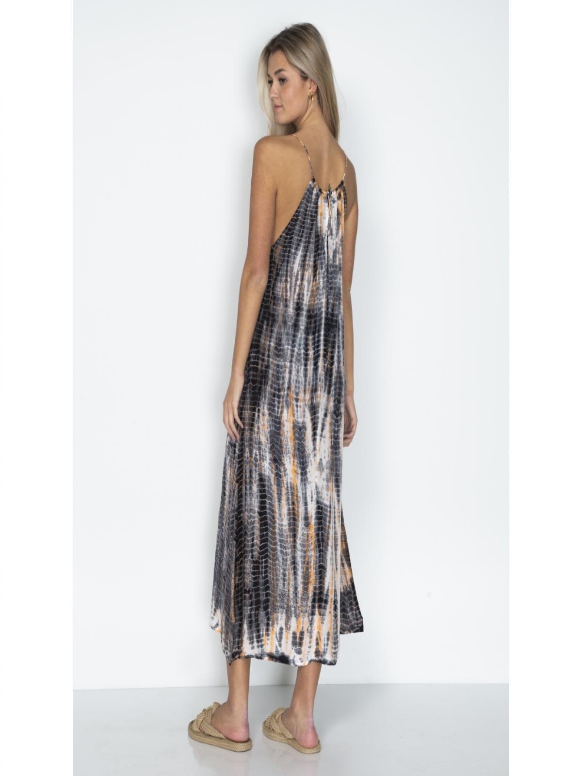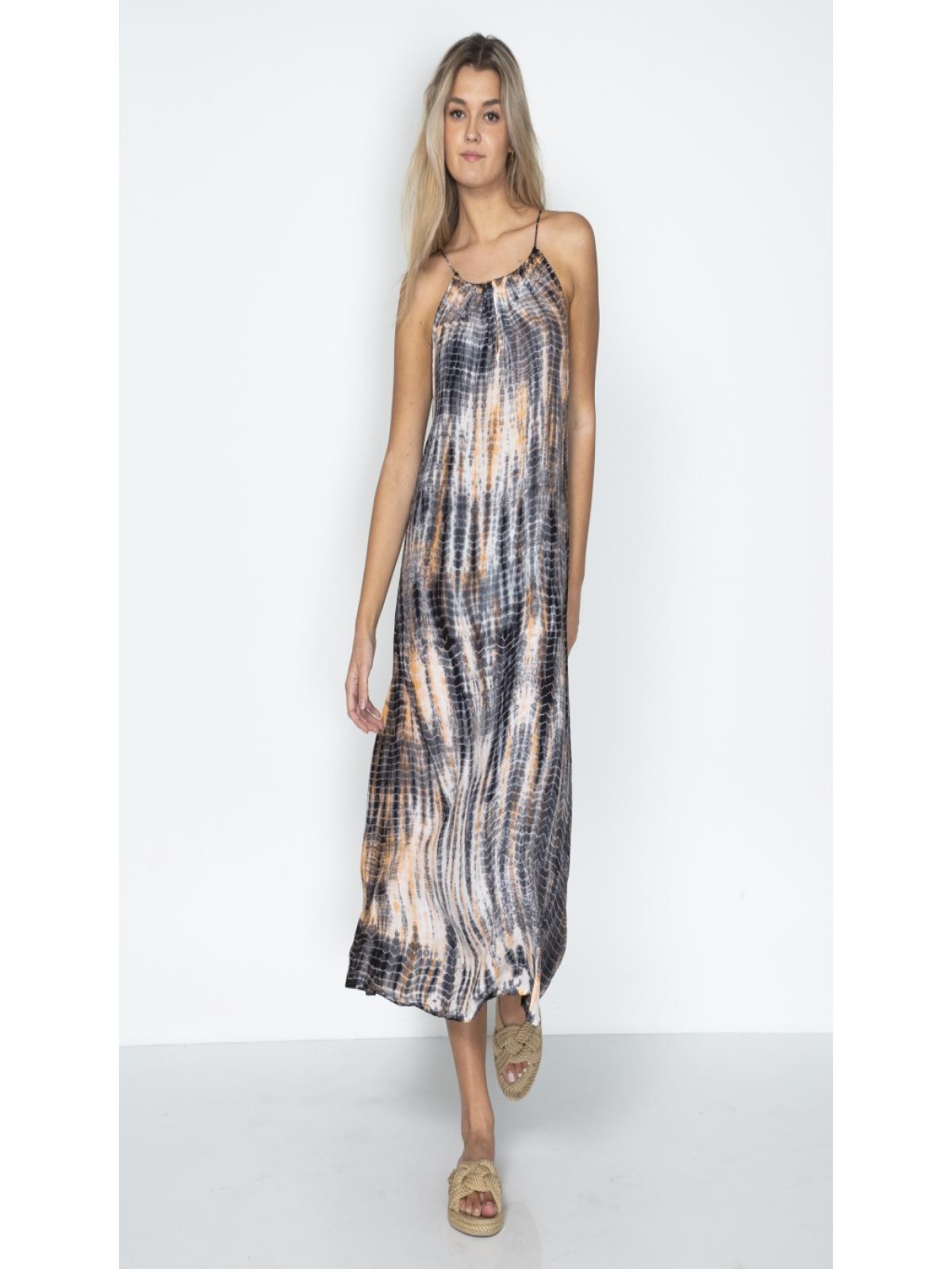 7606-24-644 Ez a gyönyörű kék-krém-narancs színű ruha tökéletes választás minden olyan alkalomra, ahol kényelmesen és nőiesen szeretnéd érezni magad. A ruha könnyű és sima anyagból készült, kézzel festett mintával, elöl és hátul is V-kivágással, amely egyedi és kifinomult megjelenést kölcsönöz. Könnyű és légies anyagának köszönhetően ideális nyári napokra és meleg estékre is. A hossza 125 cm.