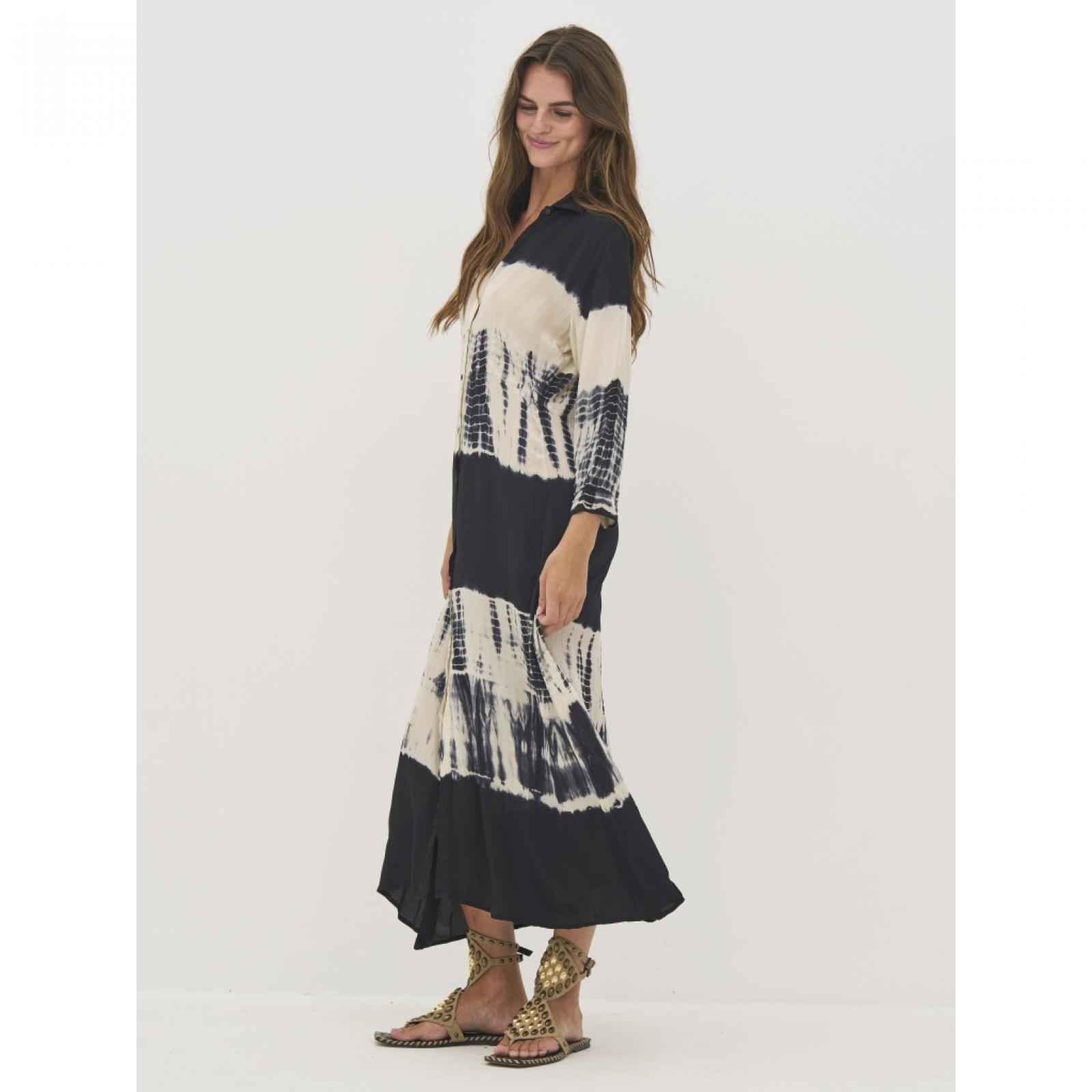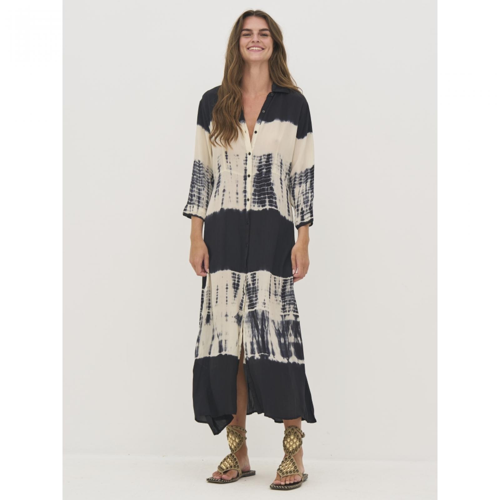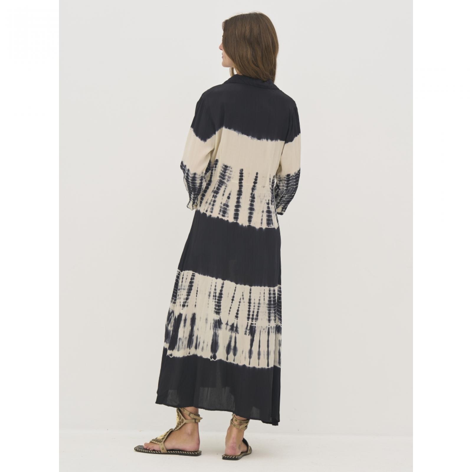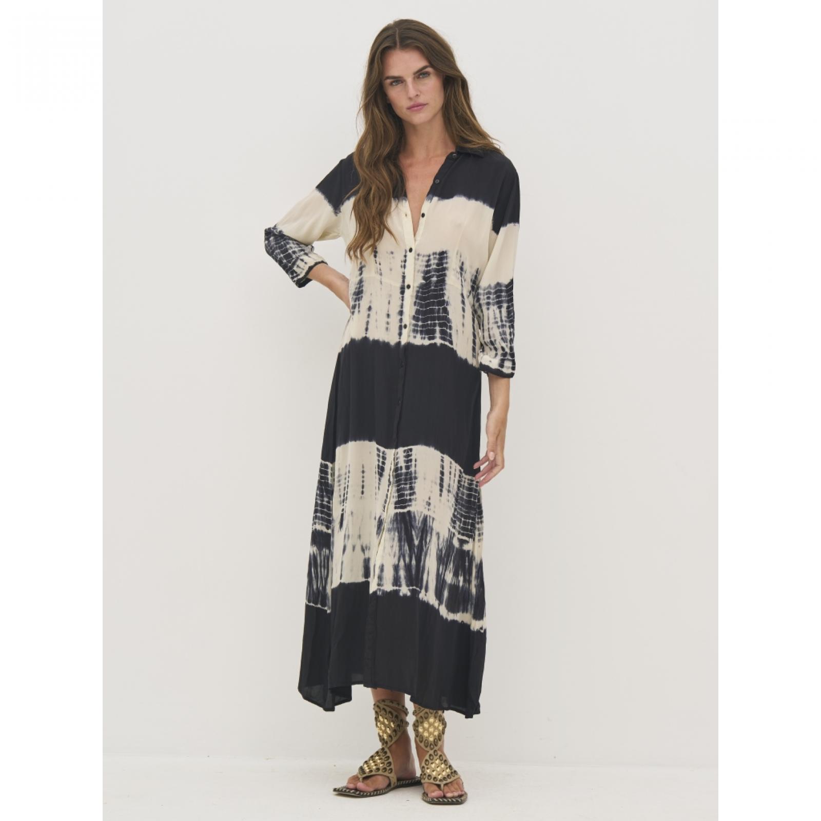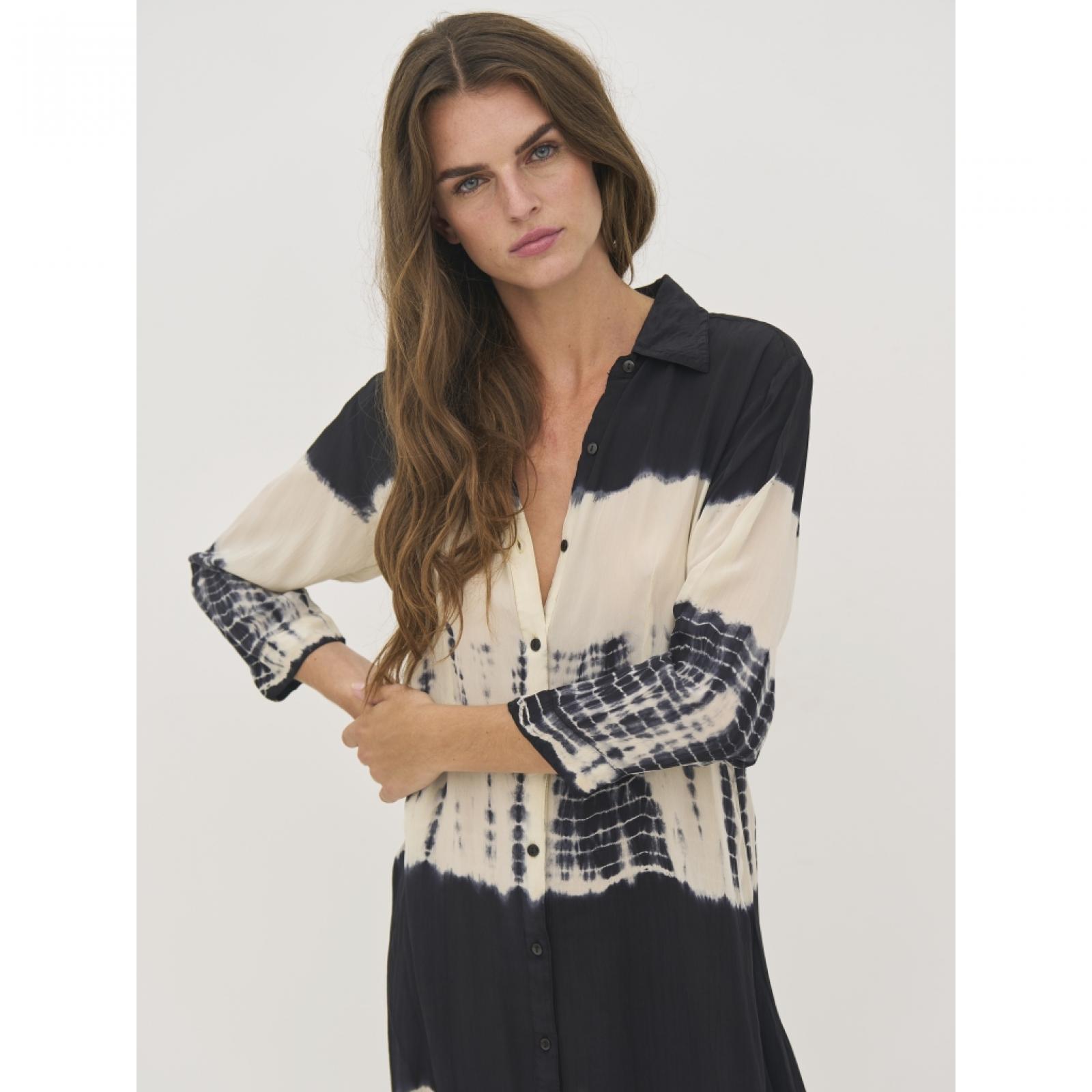 8809-24- 000 Ez a hosszú ingruha 100%-ban könnyű viszkózból készült, amely puha és jól szellőző esést biztosít. Teljes gombsorral rendelkezik, így zárva ruhaként, nyitva pedig könnyű felsőként is viselhető. A laza szabás és a 3/4-es ujjak könnyed, lebegő sziluettet hoznak létre, ami kényelmes viseletet biztosít. Az egyedi minta minden darabot különlegessé tesz, és művészi megjelenést kölcsönöz, míg a klasszikus gallér elegánsan egészíti ki a letisztult dizájnt. Mellbőség (karlyuknál mérve): XS: 48 / S: 50 / M: 52 / L: 55 / XL: 58 / XXL: 61 Csípőbőség (válltól 62 cm-re mérve): XS: 52,5 / S: 54,5 / M: 56,5 / L: 59,5 / XL: 62,5 / XXL: 65,5 Háthossz: XS: 123 / S: 124 / M: 125 / L: 126 / XL: 127 / XXL: 128 Ujjhossz: XS: 43 / S: 43 / M: 43 / L: 43 / XL: 43 / XXL: 43
