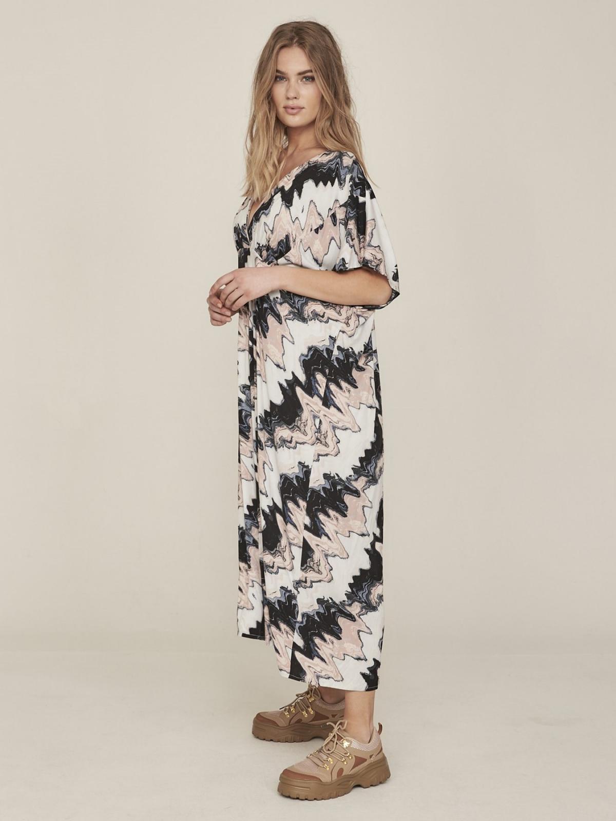 6411-23-615 Gyönyörű elegáns viszkóz ruha, fekete, szürke, rózsaszín és fehér színű mintázattal.A ruha denevérujjas széles övvel rendelkezik, amit elöl és hátul is meg lehet kötni.